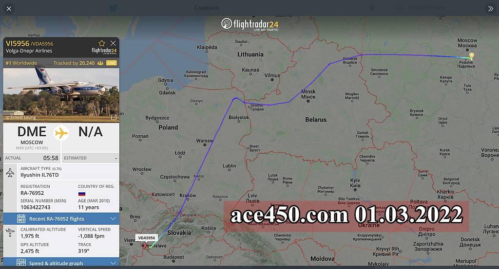 Твиттер Флайтрадара сообщает о странном маршруте Москва-Братислава транспортного российского самолета. Как известно Европа полностью закрыла небо для российской гражданской авиации