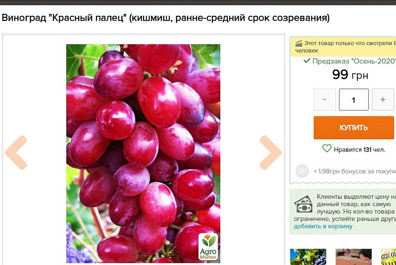 Осенью 2018 в интернет-магазине Агромаркет нет был сделан заказ на несколько саженцев винограда. В заказ, кроме всего прочего, входил кишмишовый сорт винограда с претенциозным названием «Красный палец». Как вы понимаете из названия это должен быть виноград красного цвета и без косточки.