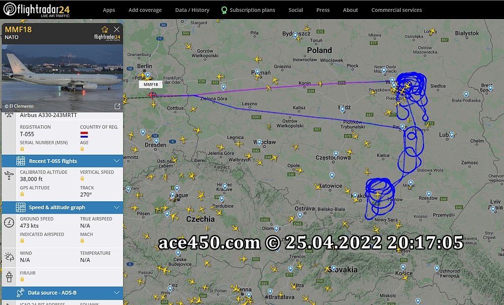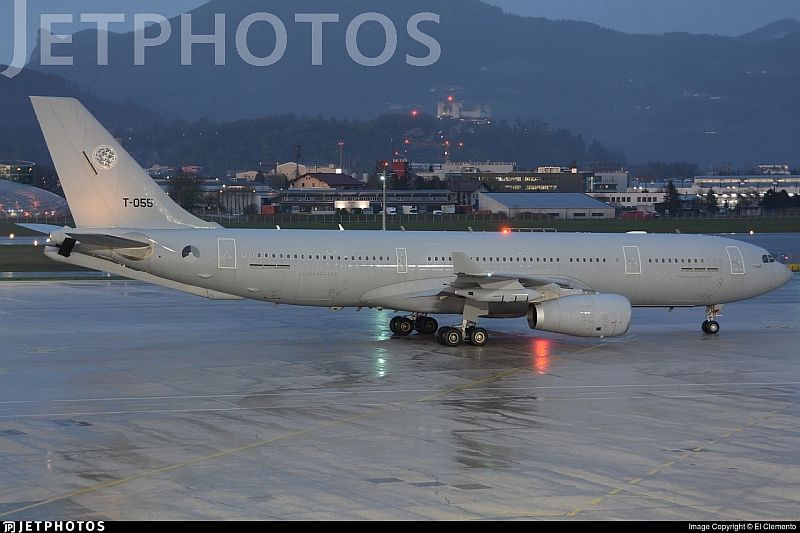 Airbus A330-243MRTT с позывным MMF18 регистрационный номер T-055 и официальной принадлежностью к структурам НАТО возвращается на аэродром в Эйдховене после длительного патрулирования на востоке Польши