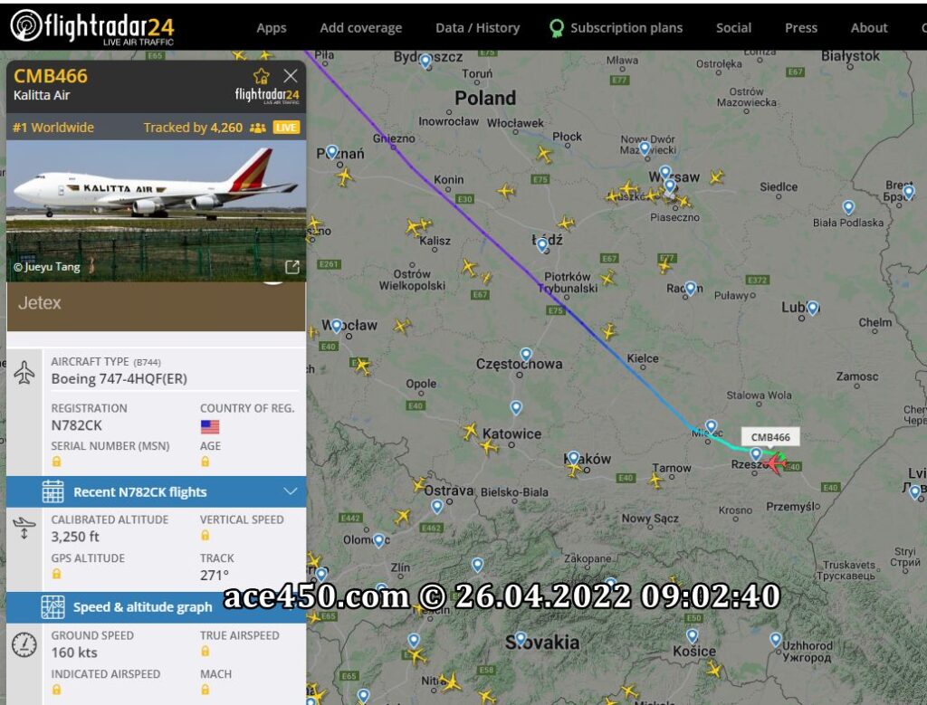 Boeing 747-4HQF(ER) регистрационный номер N782CK везет из американского города COLUMBUS грузы в польский город Жешув служащий логистическим центром поставок вооружений для Украины