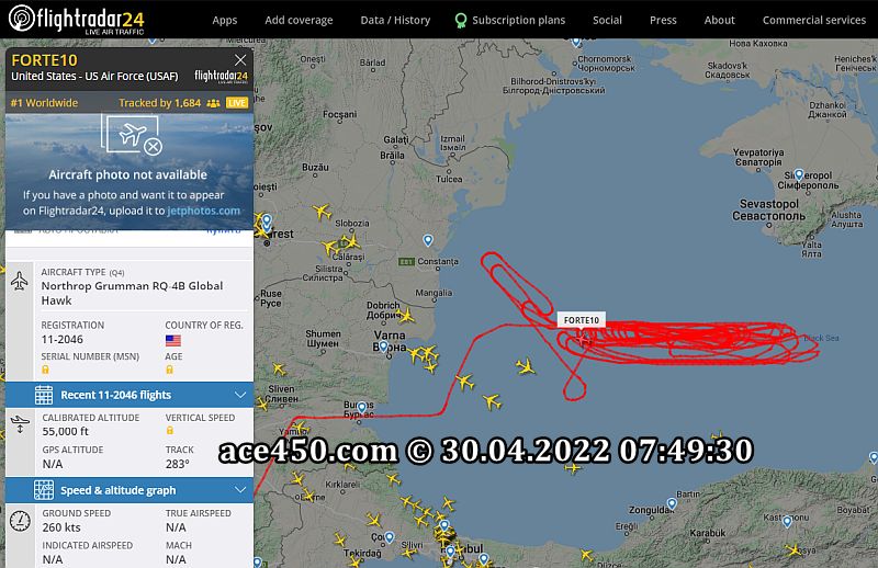 Американский стратегический беспилотный разведчик Northrop Grumman RQ-4B Global Hawk регистрационный 11-2046 патрулирует западную часть акватории Черного моря. Судя по траектории полета беспилотник Northrop Grumman RQ-4B Global Hawk позывной FORTE10 осуществлял патрулирование еще с вечера 29 апреля 2022 и до утра 30 апреля.