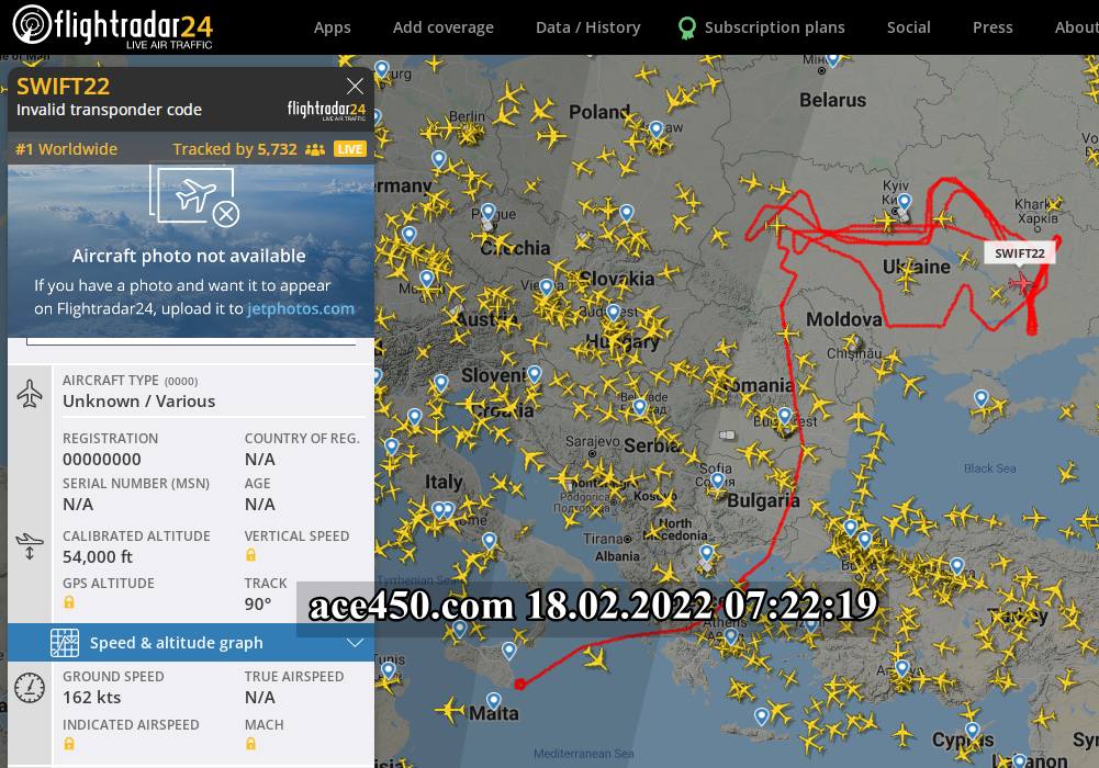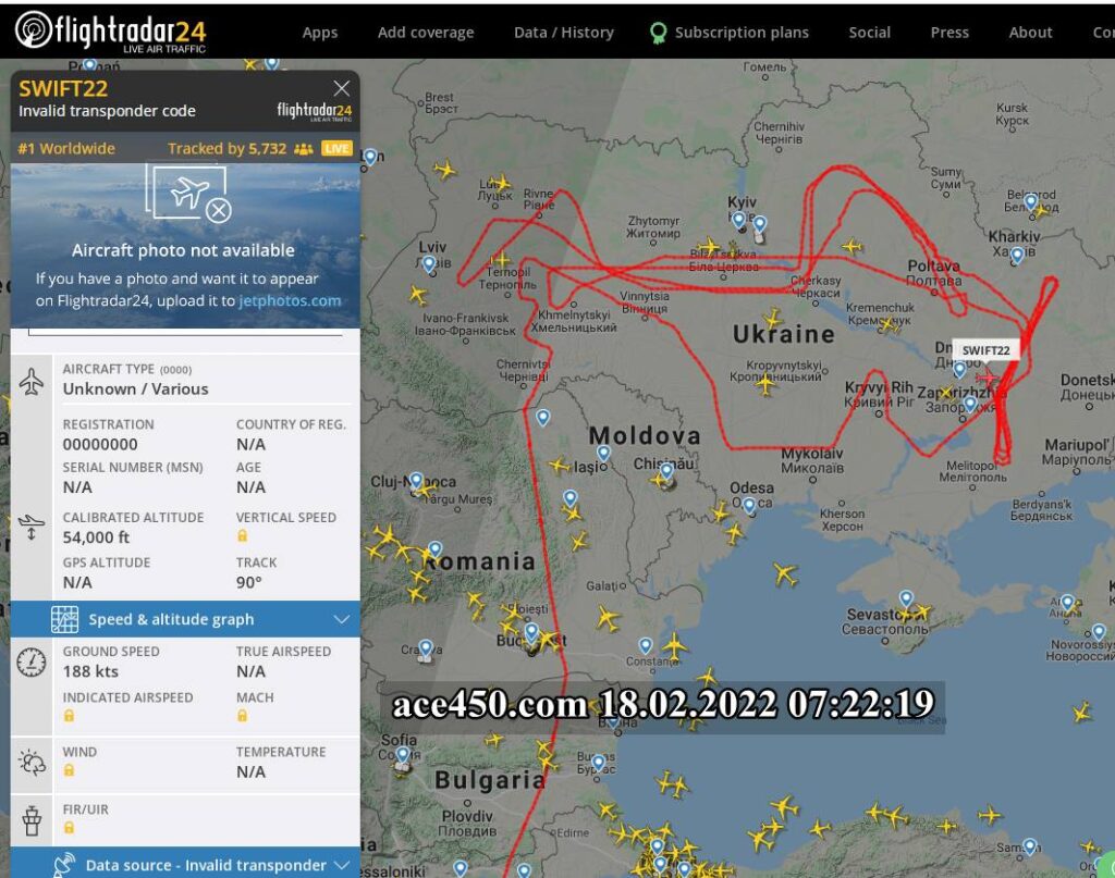 Так 18 февраля 2022 года самолет-разведчик США осуществлял полет над всей территорией Украины, мониторя обстановку по всему периметру границ Украины.