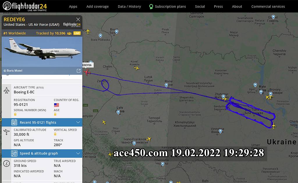Сегодня американский самолет-разведчик Boeing E-8C наматывал в небе Украины восьмерки немногим южнее Киева.