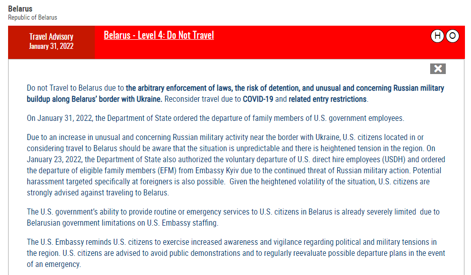 Госдеп США также предупредил, что в связи с «увеличением необычной и тревожной военной активности России вблизи границы с Украиной» граждане США, находящиеся в Беларуси или планирующие поездку в Беларусь, должны знать, что ситуация непредсказуема и в регионе наблюдается повышенная напряженность.