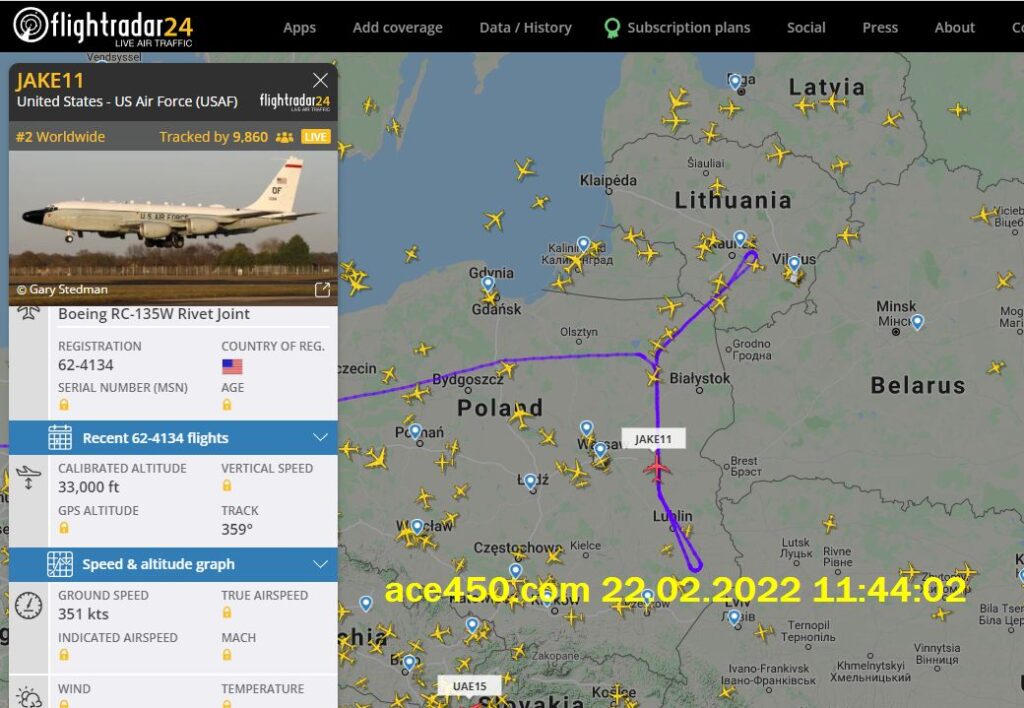 Сегодня, 22 февраля 2022, американский самолет-разведчик замечен над территорией Польши, откуда он ведет радиоразведку Беларуси. Примечательно то что впервые отмечено отсутствие ежедневных полетов американской авиации над территорией Украины которое происходило на протяжении января-февраля этого года.