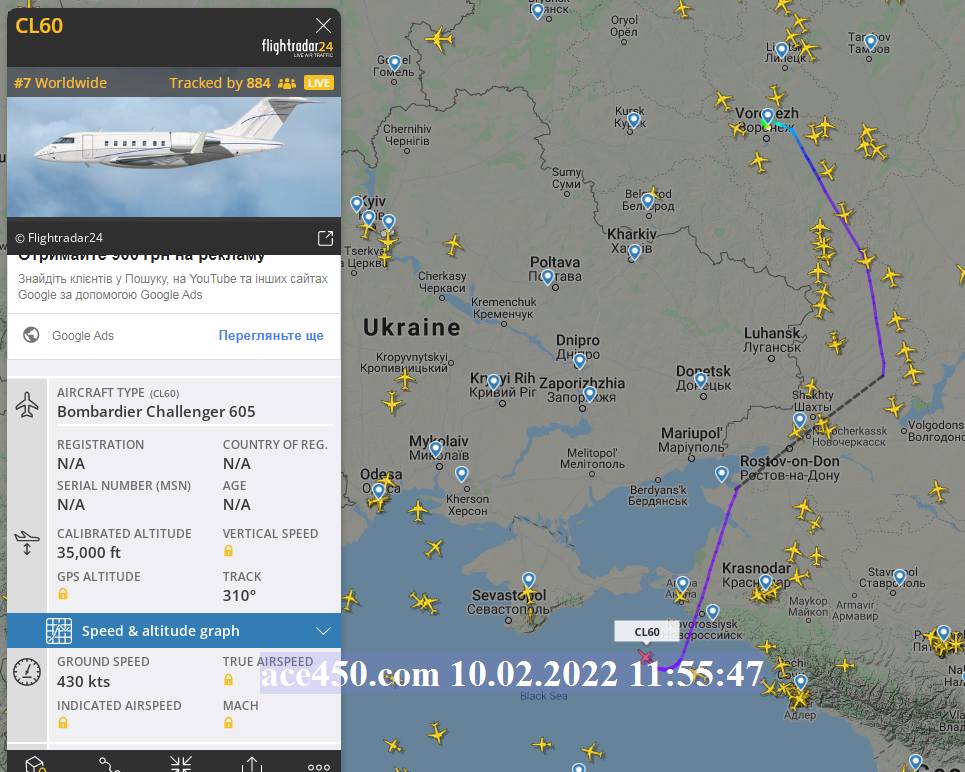 Сегодня, 10 февраля 2022 года сервис отслеживания полетов в интернете отметил наличие американского новейшего совершенно секретного самолета-разведчика под позывным CL60 в небе над Черным морем в берегов Крыма.