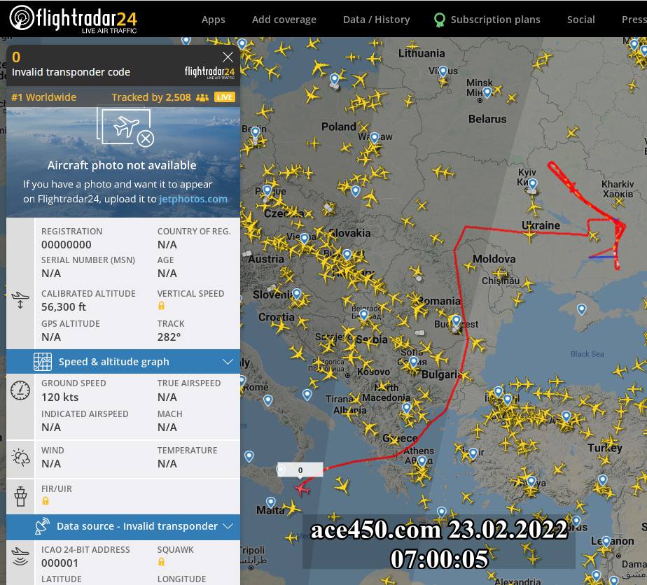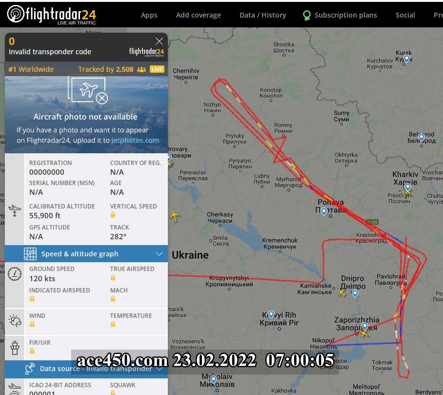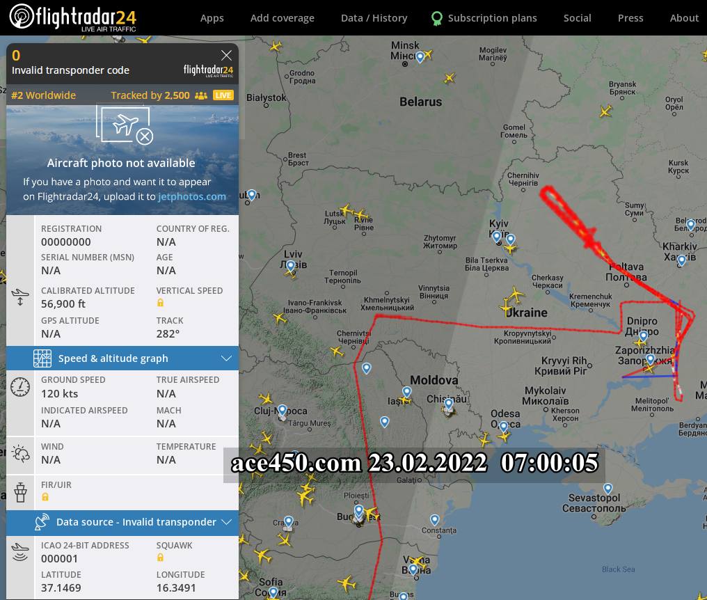 В ночь с 22 на 23 февраля 2022 над территорией Украины отмечено наличие американского разведывательного аппарата, судя по высоте полета — более 17 км, вероятнее всего это был стратегический тяжелый разведывательный дрон типа FORTE11 или похожий.
