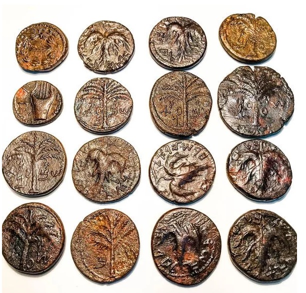 На монетах можно увидеть на еврейские символы, такие как виноградная лоза, арфа, пальма и другие.