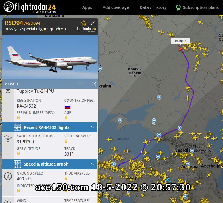 Вечером 18 мая 2022 из столицы Турции Анкара в Москву вылетел правительственный борт RSD94 регистрационный номер RA-64532 самолет Tupolev Tu-214PU