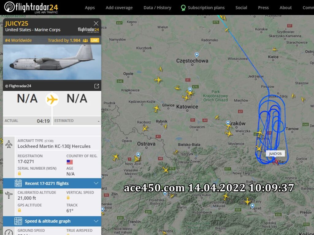 Американский самолет-заправщик из Корпуса морской пехоты США осуществляет полет на восточной границе Польши. Главный вопрос — что заправляют топливозаправщики в небе на границе с Украиной