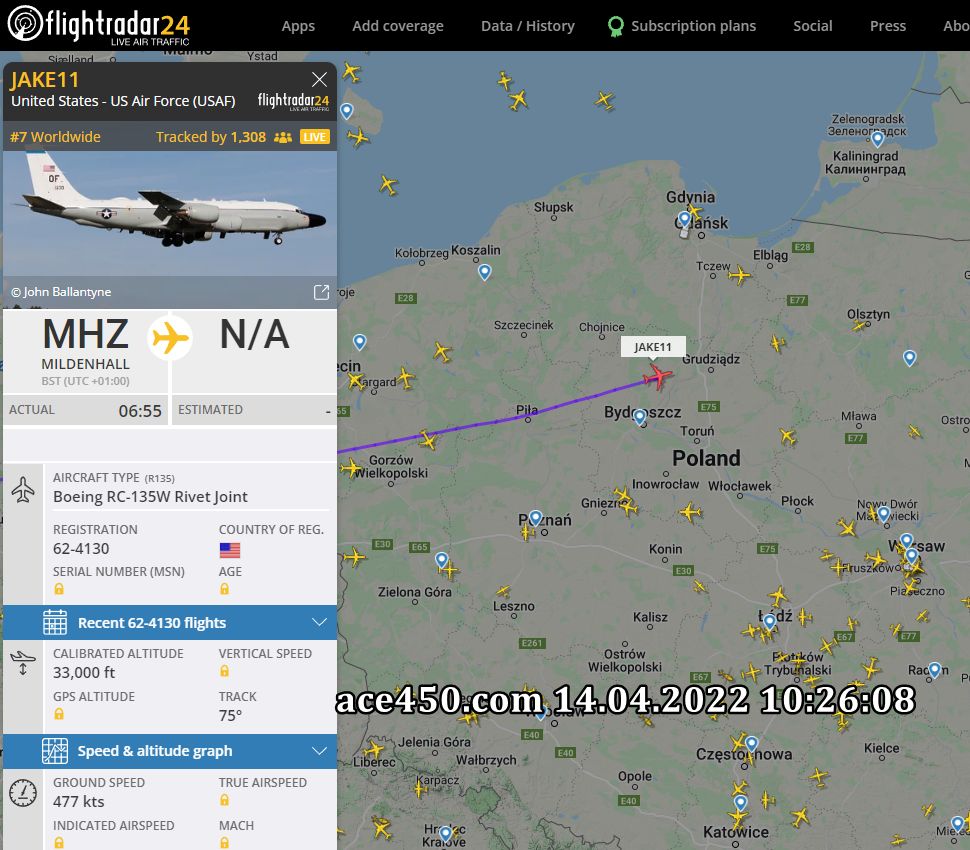 Аэроразведка США — JAKE11 вылетел для разведывательной миссии на восточный фланг НАТО — направление полета — границы российской Калиниградской области и граница Беларуси