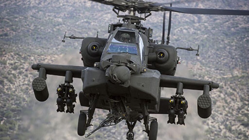 Отмечается, что вертолеты Apache AH64 E могут быть вооружены до 16 противотанковых снарядов Hellfire, 76 70-мм ракет Hydra и 30-мм цепной пушкой.