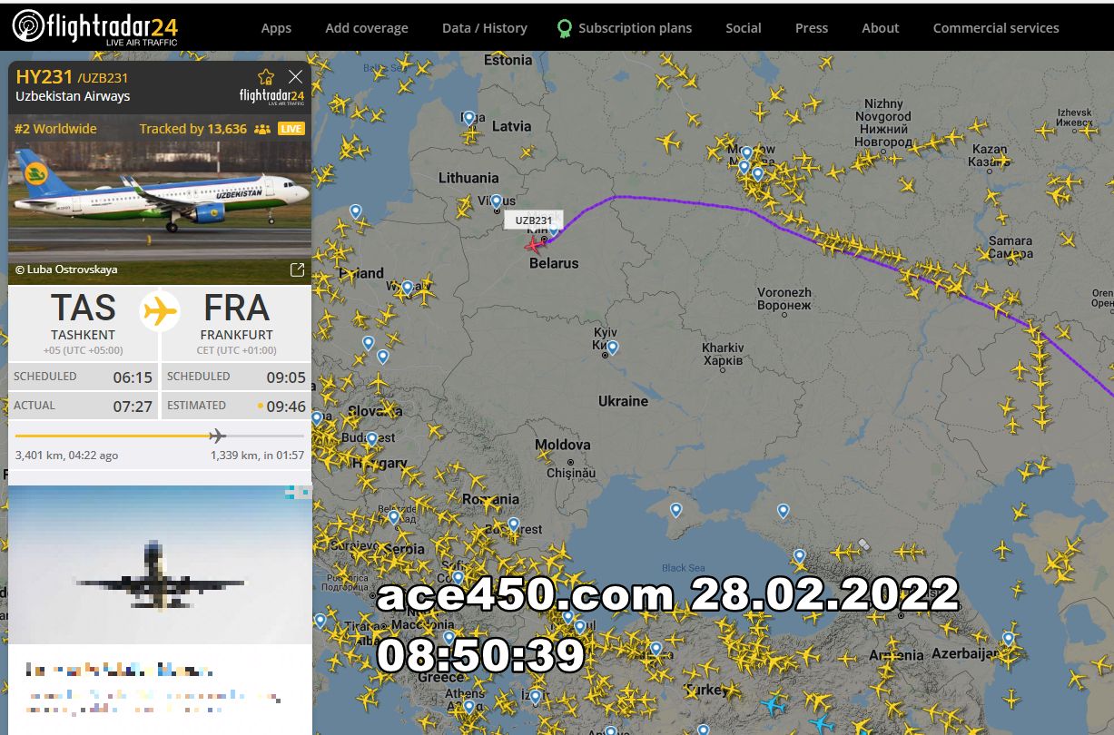 Далеко стороной облетают территорию русско-украинской войны все самолеты мира. Только рейс из Ташкента вФранкфурт смело летит через территорию Беларуси