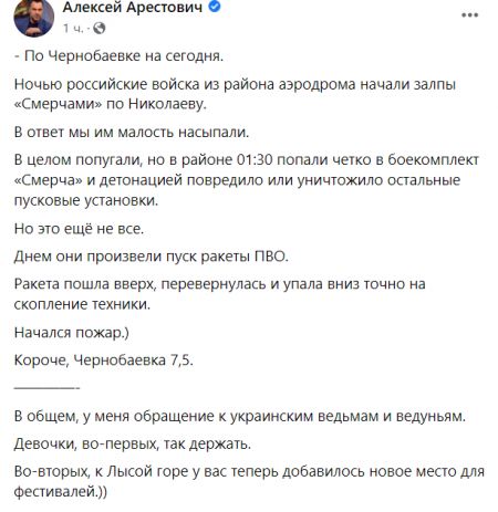 «По Чернобаевке на сегодня. Ночью российские войска из района аэродрома начали залпы «Смерчами» по Николаеву.