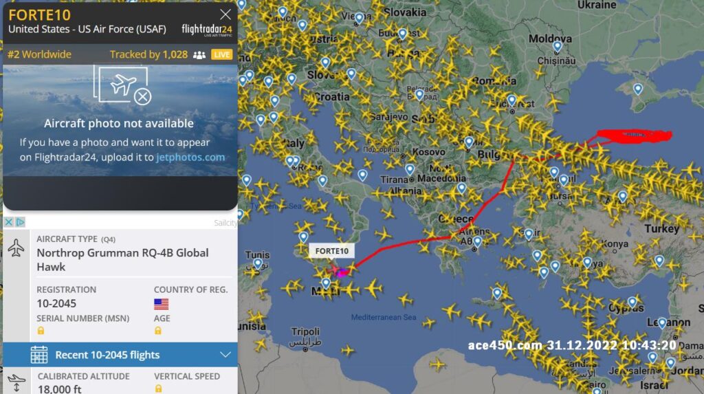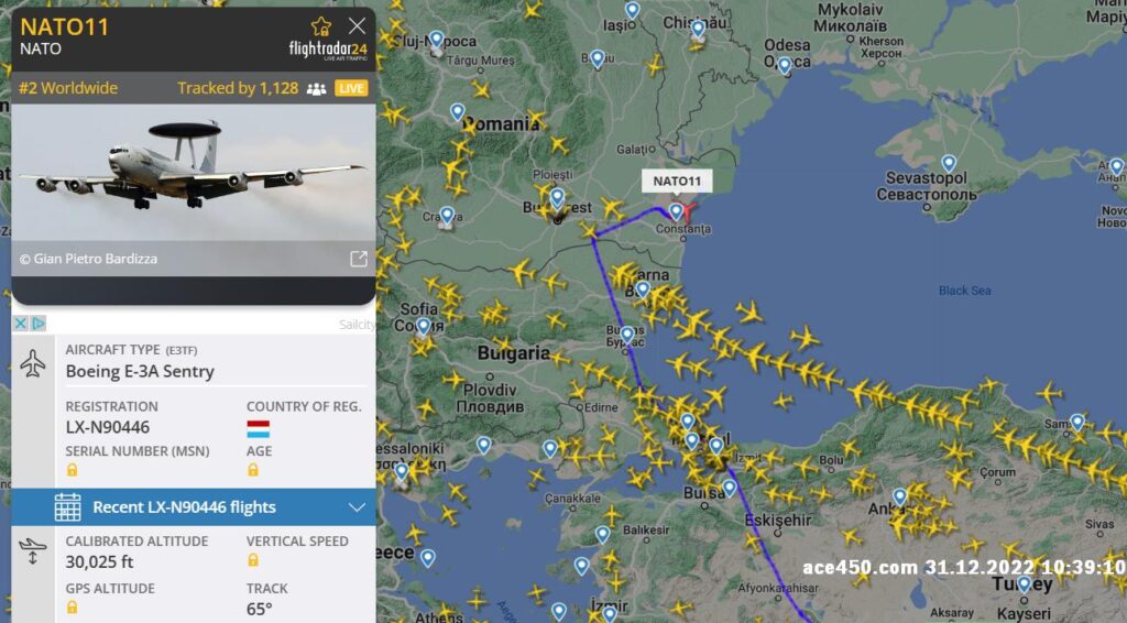 На смену американскому разведывательному дрону NATO 10 Northrop Grumman RQ-4B Global Hawk в регион Черного моря из Турции отправлен самолет-разведчик Boeing E-3A Sentry с позывным NATO 11