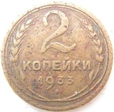 Две советские копейки 1933 года, времен создания колхозов и ударной индустриализации страны остались практически неизменны и варианте «поздних советов»
