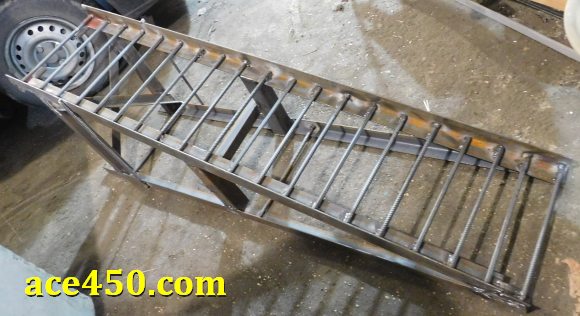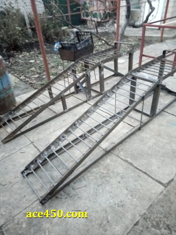 Часть вторая — изготовление эстакады для авто — подъемная рампа как часть эстакады. Машину как-то надо поднять на высоту опорной площадки эстакады и для этого необходима наклонная часть подъемной рампы. Именно по ней авто заезжает на опорные площадки. Конструкция этой части эстакады и будет рассмотрена далее и проиллюстрирована фото.