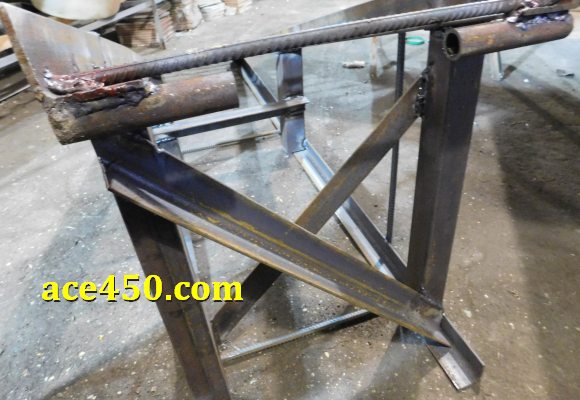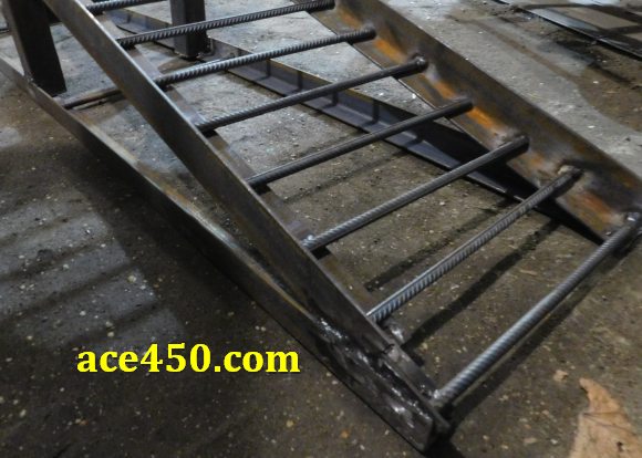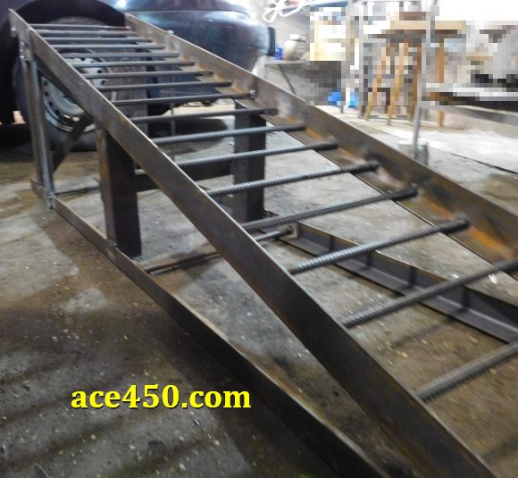 И как на опорной площадке так и на подъемной рампе эстакады опорой для колес авто служит арматура 10-ка, приваренная на расстоянии 8 см друг от друга.