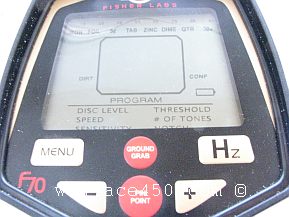Фото экрана отбражающего всю доступную информацию для пользователя — глубина, проводимость, достоверность измерений а также указатель режимов работы МД. В нижней части — шесть кнопок управления — Меню, Отстройка от грунта, Изменение рабочей частоты, кнопка уменьшения (-), кнопка Пинпойнт, кнопка увеличения (+)