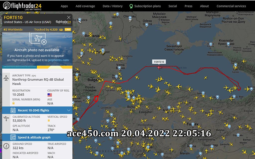 FORTE10 nightflight over Black Sea For the first time since the beginning of the Russian invasion of Ukraine, a night flight of an American reconnaissance drone was observed over the Black Sea. Northrop Grumman RQ-4B Global Hawk FORTE10 nightflight over Black Sea +10