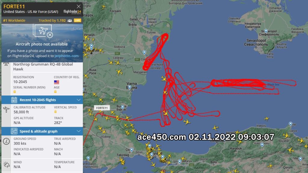 Также традиционно внимание Northrop Grumman RQ-4B Global Hawk уделено южному берегу Крыма и в частности акватории Черного моря примыкающей к базе ЧФ России — Севастополю.
