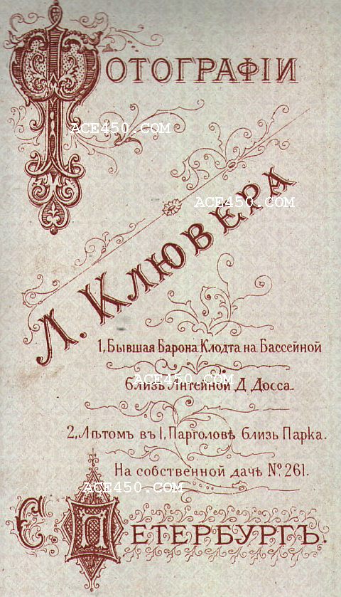 Фотографии Л.Клювера Фотографии Л.Клювера Бывшая барона Клодта на Бассейной близ Литейной Д.Досса . Летом в Парголово близ парка на собственной даче №261 Санкт-Петербург +100