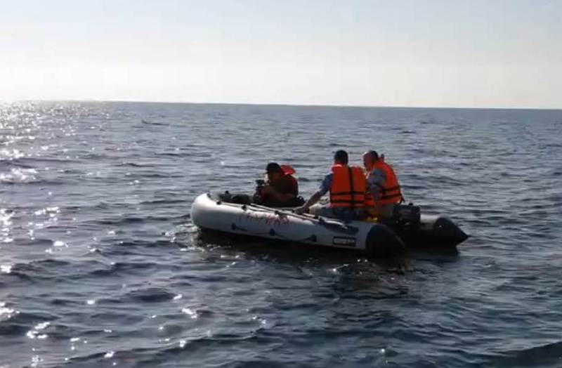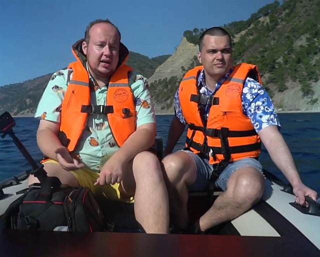 В лодке находятся два человека которые уже ранее были в кадре и еще один человек, по видимому оператор дрона т.к. в руках держит вещь похожую на пульт управления.