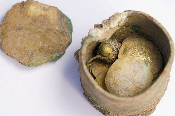 Он представлял из себя бронзовый горшок с 24 золотыми монетами и золотой серьгой и был спрятан между двумя камнями в средневековой яме для отвода грунтовых вод глубиной около 1,5 метров.