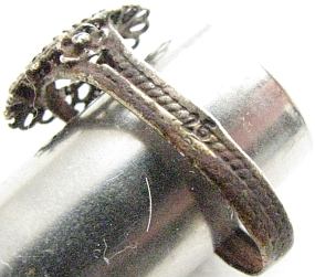 Кольцо довольно старое, либо позолоченное либо из золота с большим количеством примеси (низкопробное). На внешней стороне кольца еле прочитывается первоначальная маркировка, зато хорошо видна новая маркировка пробы — 26.