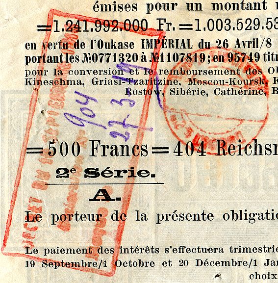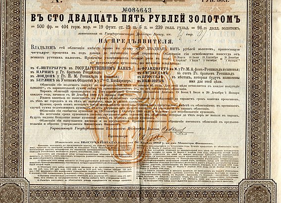 Для пополнения царской казны императорское правительство проводило регулярный выпуск облигаций . Данная облигация в сто двадцать пять рублей золотом предназначена для развития железнодорожного движения в царской России в конце 19 века