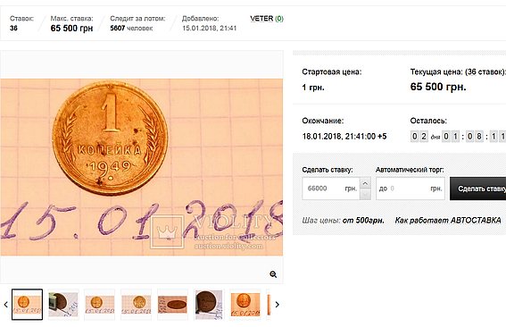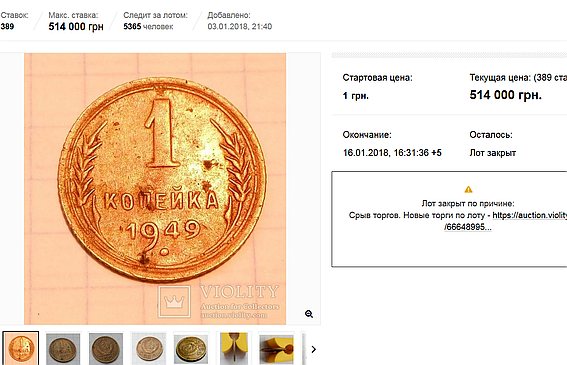 Уникальная копейка 1949 года была выставлена на торги и после недели торгов на последней ставке продавец отказался ее выкупать. Как потом объяснял незадачливый покупатель этой копейки 1949 года — ребенок побаловался с его смартфоном и случайно сделал ставку в более чем полмиллиона гривен !!