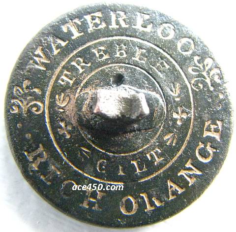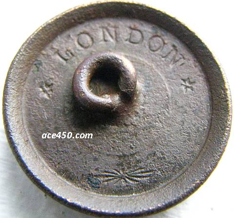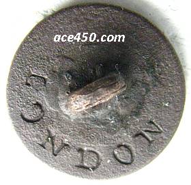 Казалось бы что там интересного ? А вот интересное в таких пуговицах находится сзади, с оборотной стороны пуговицы. Там есть надписи и изображения.Вот такая вот большая пуговица London с обратной стороны и легким орнаментом из звездочек. Или вот еще пуговица из той же серииМаленький Лондон он тоже London на лысой пуге. Есть малочитаемый текст Есть вообще лысые пуговицы лысые с двух сторон — на оборотной стороне пуговицы тоже ничего нет.А есть такие скромняги лысые пуговицы на обороте которых текст размещен в две строки по кругу и позолоченными буквами .waterloo пуговица Waterloo Rich Orange и с не простенькими кривоватыми рисками а с осмысленным позолоченным букетом и крестиками разделителями текста.