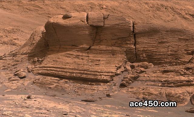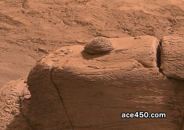 Странное образование на обветренной скале на Марсе. На сглаженной ветром и песком скале расположен явно чужеродный предмет.