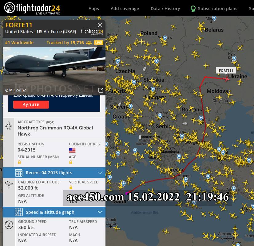 Ночную разведку в небе Украины сегодня, 15 февраля 2022 года проводит американский стратегический разведывательный беспилотник Northrop Grumman RQ-4A Global Hawk с позывным FORTE11