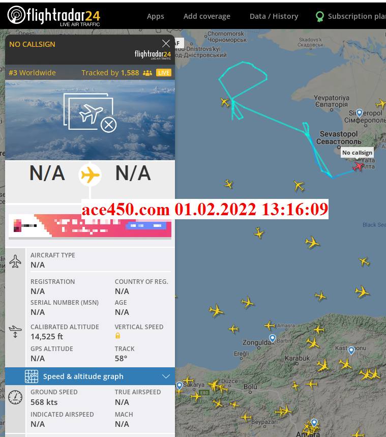 Сегодня, 1 февраля 2022 года самолет без опознавательного отклика осуществляет разведывательный полет у западных берегов Крыма.