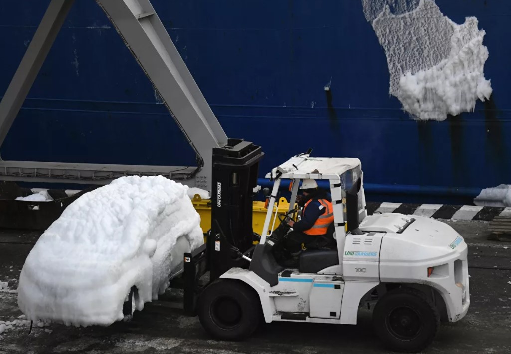 Для разгрузки использовались не только стандартные портовые краны и погрузчики а и топоры для скалывания слоя льда с колес за которых и стропили ледовиков