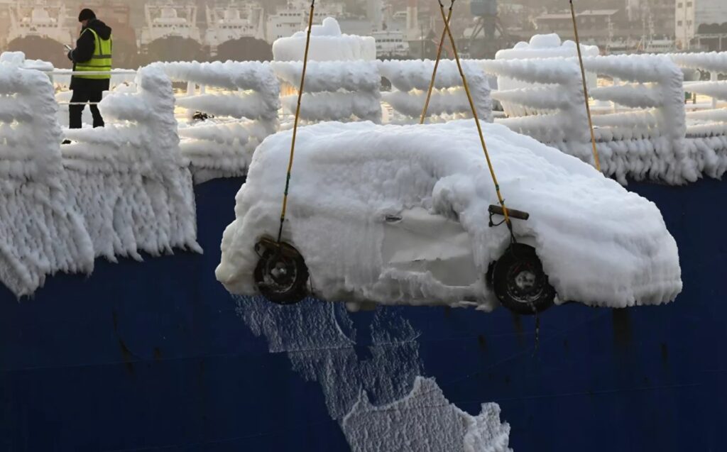 Удивительная картина ледяных машин не испугала портовых рабочих и авто все же разгрузили.