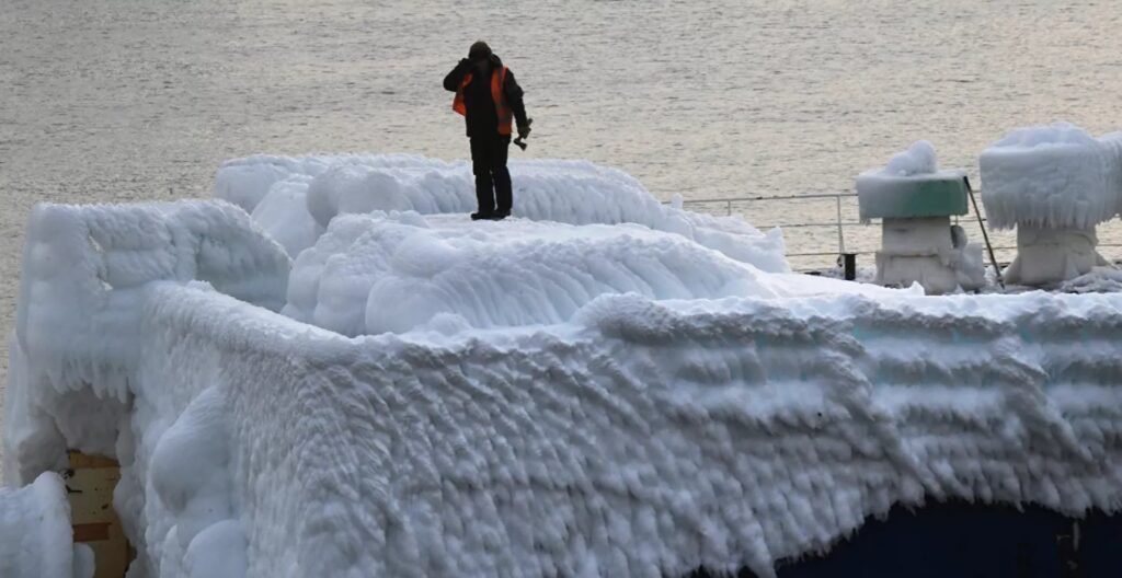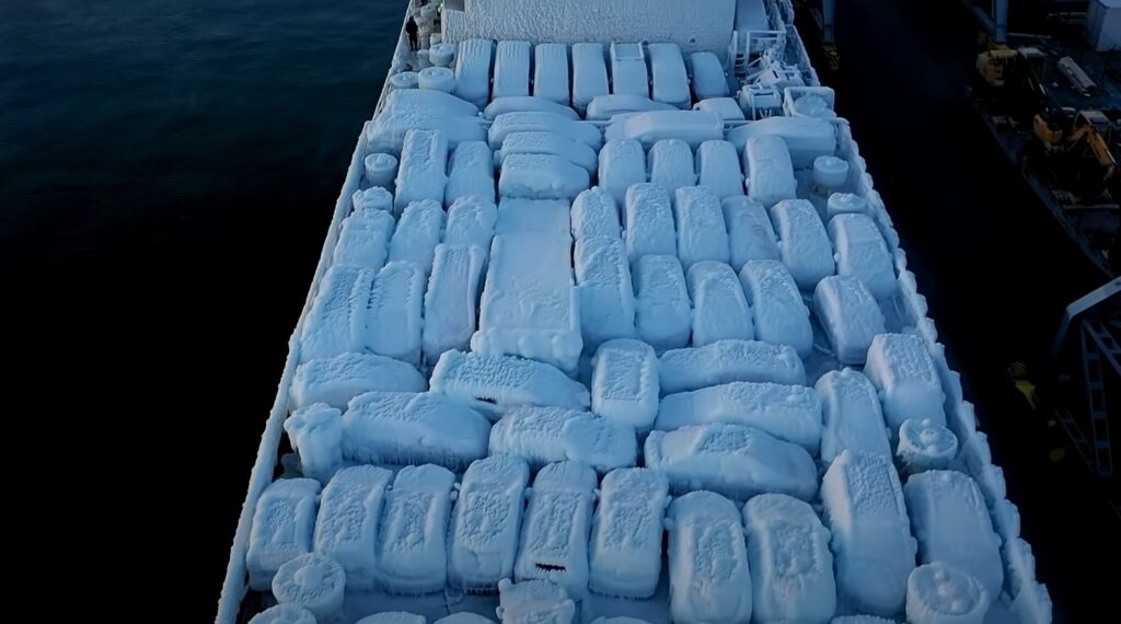 По пути корабль попал в ледяной шторм и груз авто на палубе покрылся очень толстым слоем льда.