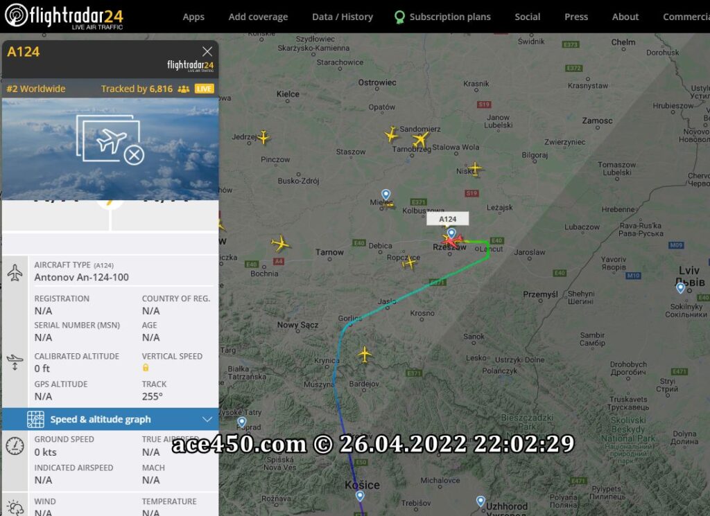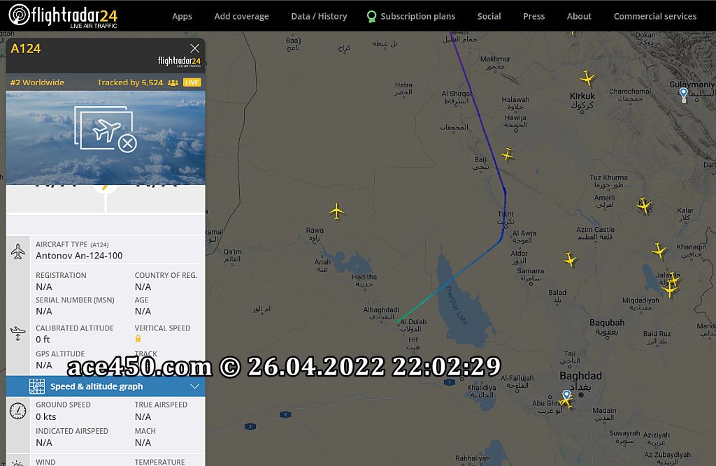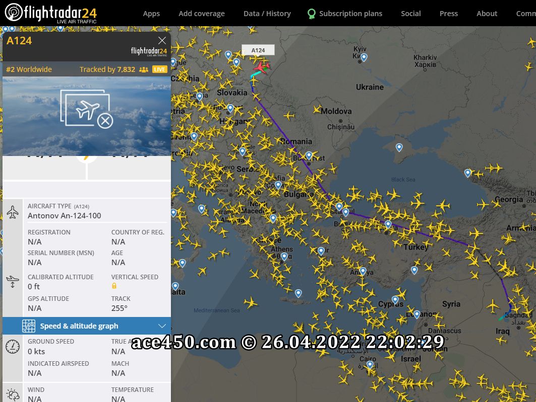 Сегодня замечен рейс украинского военно-транспортного самолета АН-124-100 из Ирака в логистический центр снабжения Украины вооружением расположенный на территории Польши в городе Жешув