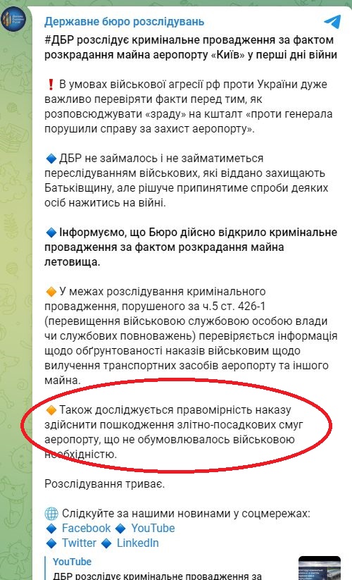 Спустя полгода, когда в Киев уже давно вернулась практически мирная жизнь сотрудники ДБР начали расследовать и вменять в вину генералу Кривоносу именно повреждение ВПП при осуществлении обороны аэродрома.