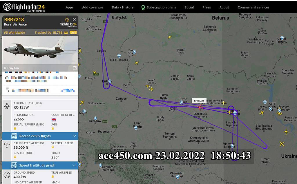 Сейчас английский самолет-разведчик RC-135W с позывным RRR7218 отслеживает обстановку в северо-западной части Украины, на границе с Беларусью.