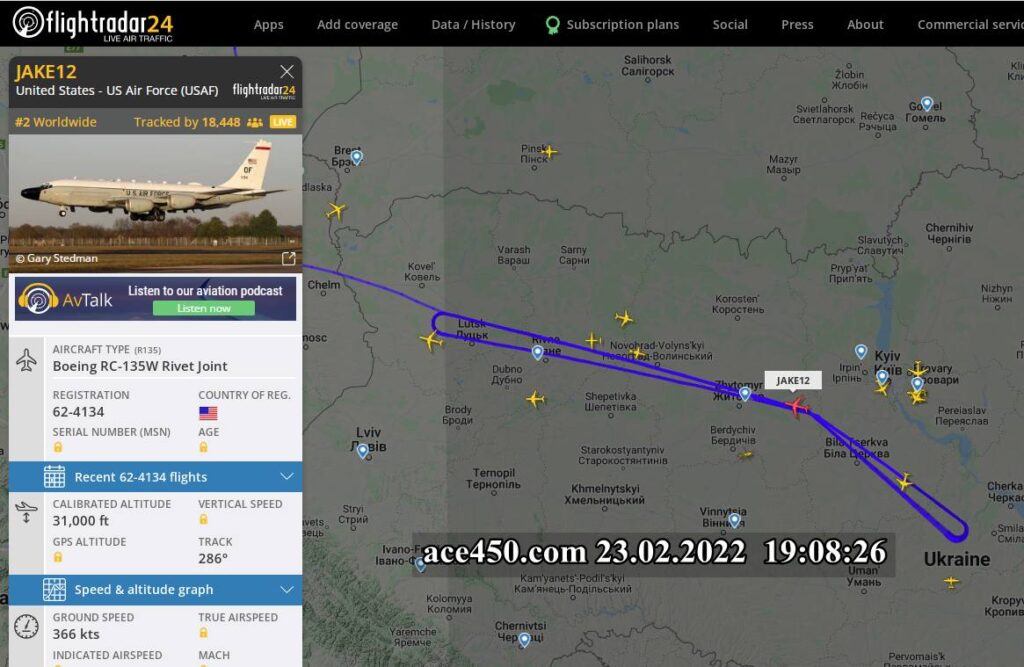 В то же самое время американский Боинг радиотехнической разведки Boeing RC-135W Rivet Joint также барражирует на северной границе Украины, оценивая военную обстановку на беларусской границе.