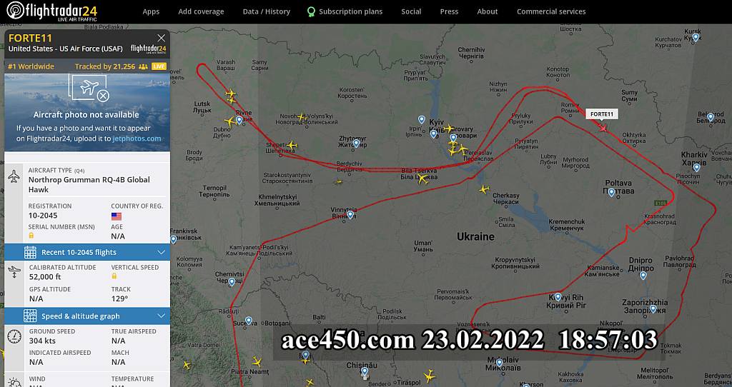Американский стратегический беспилотник Northrop Grumman RQ-4B Global Hawk c позывным FORTE11 строит свою траекторию полета таким образом что-бы перекрывать свой полет с полетом самолета ВВС Великобритании RC-135W с позывным RRR7218 , показанный выше.