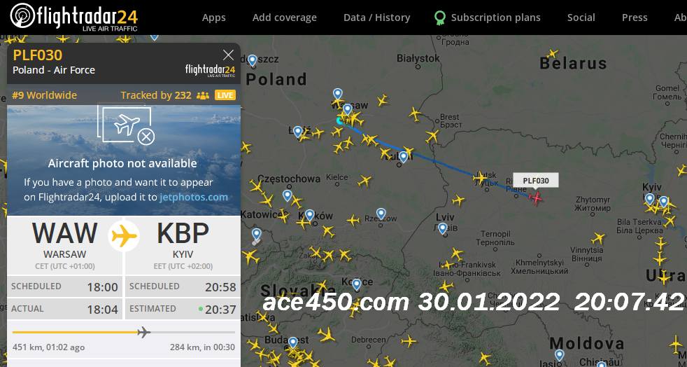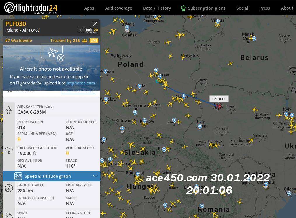 Польские ВВС отправили сегодня военный самолет по маршруту Варшава — Киев. Известно что это самолет с позывным PLF030 и тип польского самолета CASA C-295M. Это лёгкий турбовинтовой транспортный самолёт производства Airbus Military.
