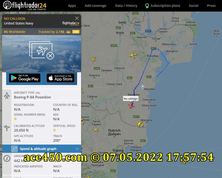Американский самолет-разведчик Военно-морских сил США Boeing P-8A Poseidon находится в воздушном пространстве Румынии и наблюдает за обстановкой над акваторией Черного моря и вокруг острова Змеиный а также за ракетными ударами по Одессе