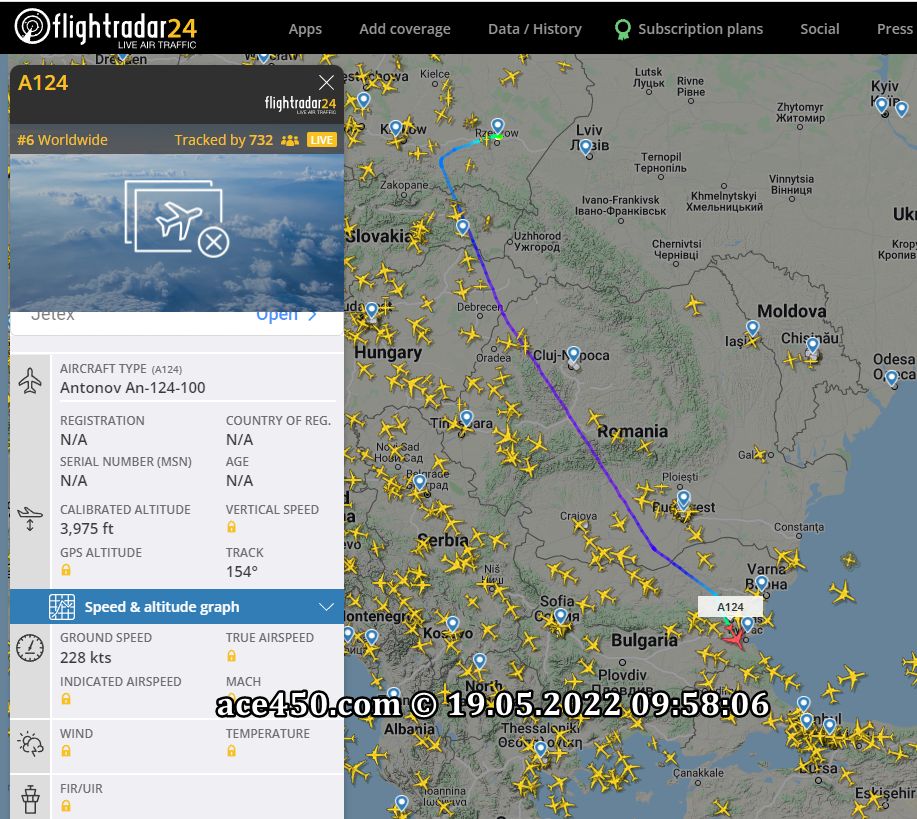 В данном случае украинский АН-124-100 совершил посадку в аэропорту болгарского Бургаса, где вероятнее и произойдет загрузка байрактаров для Украины.