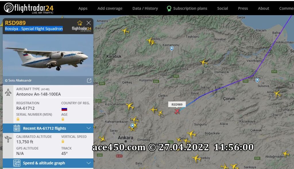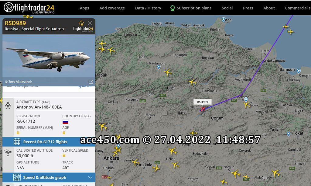 Сегодня 27 апреля в столицу Турции Анкару направляется российский правительственный лайнер Antonov An-148-100EA регистрационный номер RA-61712 позывной RSD 989