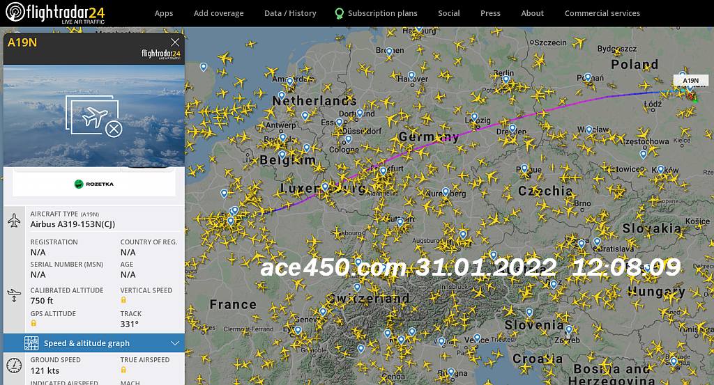 Также, из Парижа в Варшаву сегодня прибыл неопознанный самолет Airbus A319-153N(CJ) с позывным A19N