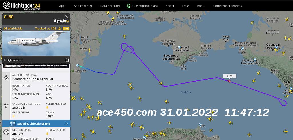 Bombardier Challenger 650 с позывным CL60 осуществляет разведывательный полет над акваторией Черного моря у берегов Крыма.