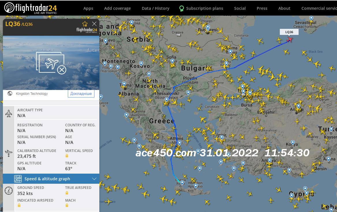Также к берегам Крыма дополнительно держит курс неизвестный летательный аппарат с позывным LQ36 взлетевшим с аэродрома Крита CHANIA откуда обычно взлетают самолеты разведчики НАТО и беспилотники типа FORTE12